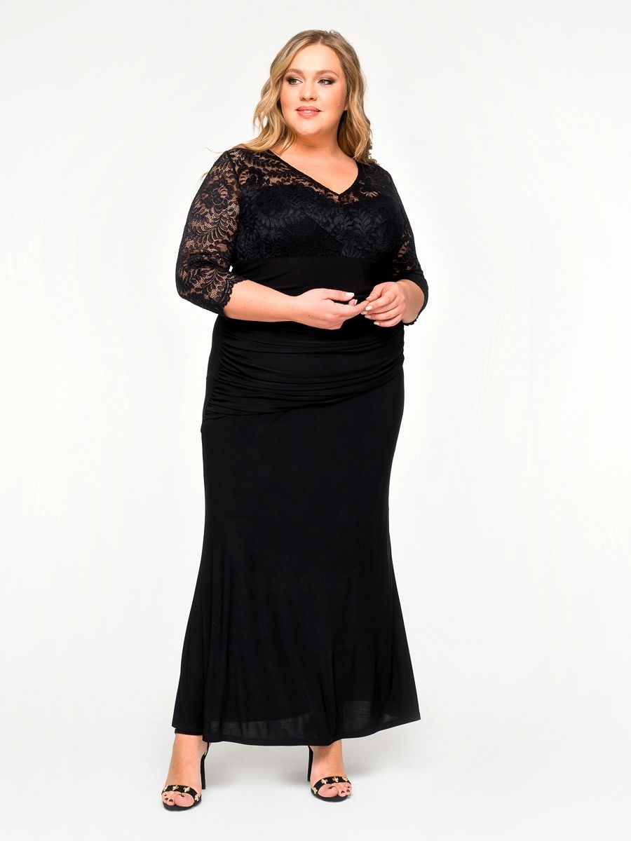 Романтичное вечернее длинное платье из трикотажа. Верхняя часть из кружева, отрезная. По переду юбки, под областью живота подрез, отрезная деталь декорирована драппировкой, которая скрадывает нежелательные нюансы этой части фигуры. Рукав 3/4 из кружева. Платье на подкладке.