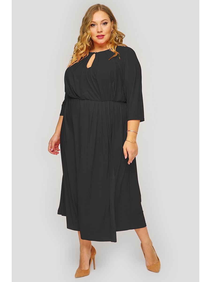 Коктейльное платье из струящегося трикотажа. Верхняя часть отрезная на подкладке, с мягкими складками по горловине и нижнему срезу. Рукав 3/4.