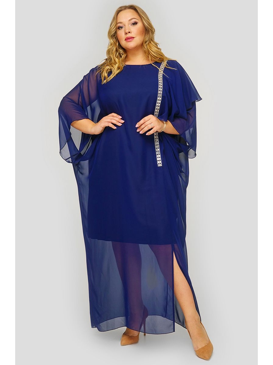 Длинное платье из шифона на подкладке. По левому рельефу втачано "крылышко", которое переходит с переда на спинку. По переду пришивное украшение со стразами. По низу левого рельефа - разрез. Вырез горловины круглый.