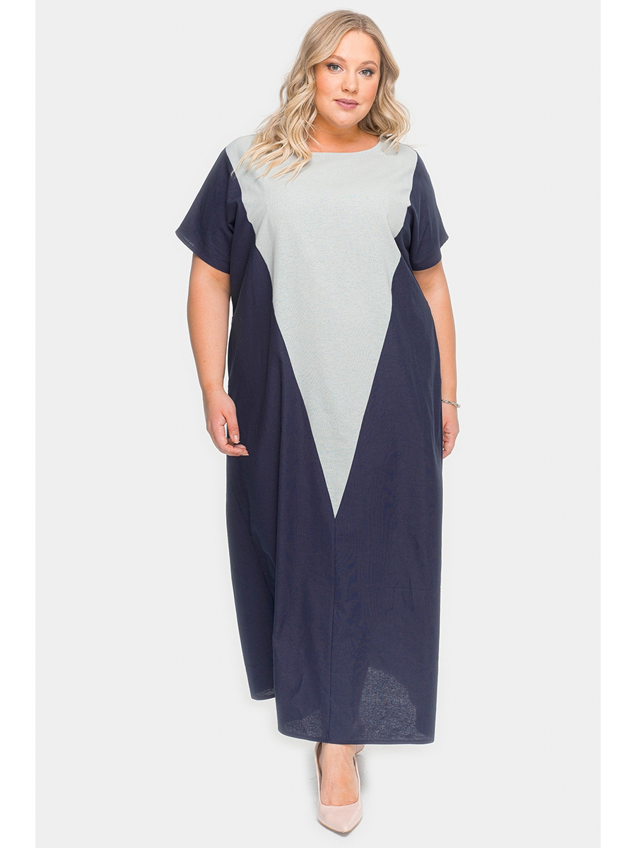 Платье длинное, свободного силуэта, из смесовой ткани, содержащей в составе лен и вискозу.. По переду вставка в форме вытянутого треугольника жемчужного цвета. Вырез горловины "лодочка".