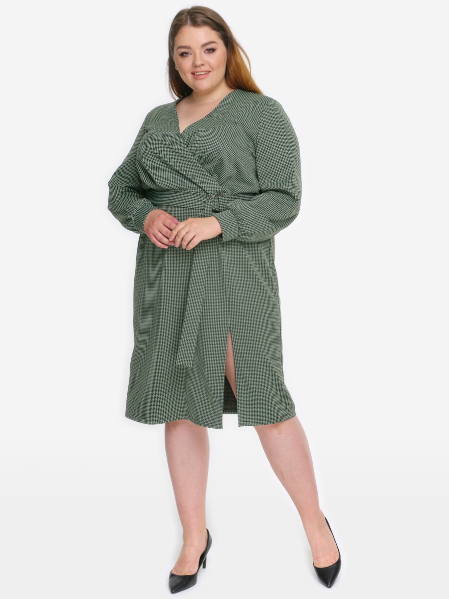 Платье из джерси полуприлегающего силуэта в актуальном принте "гусиная лапка". Верхняя часть переда отрезная на уровне талии, с запАхом. По юбке переда разрез на уровне левого рельефа. Рукав длинный, свободный, со сборкой по нижнему срезу. Рукав заканчивается манжетом, застегивающимся на 3 пуговицы и навесные петли. Пояс фиксируется двумя полукольцами.