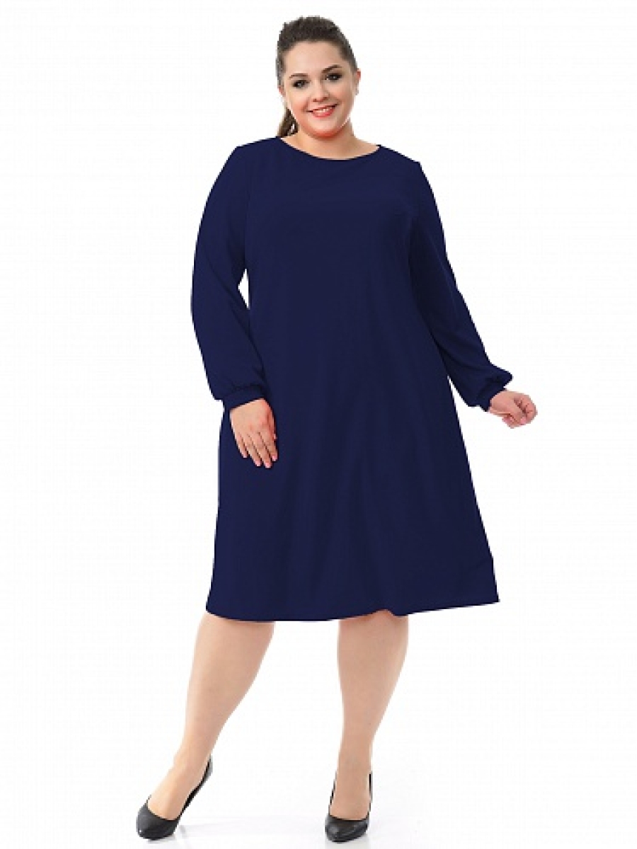 Платье А-силуэта из крепа с эластаном. Вырез горловины округлый. Рукав длинный, по низу легкая сборка, на манжете.