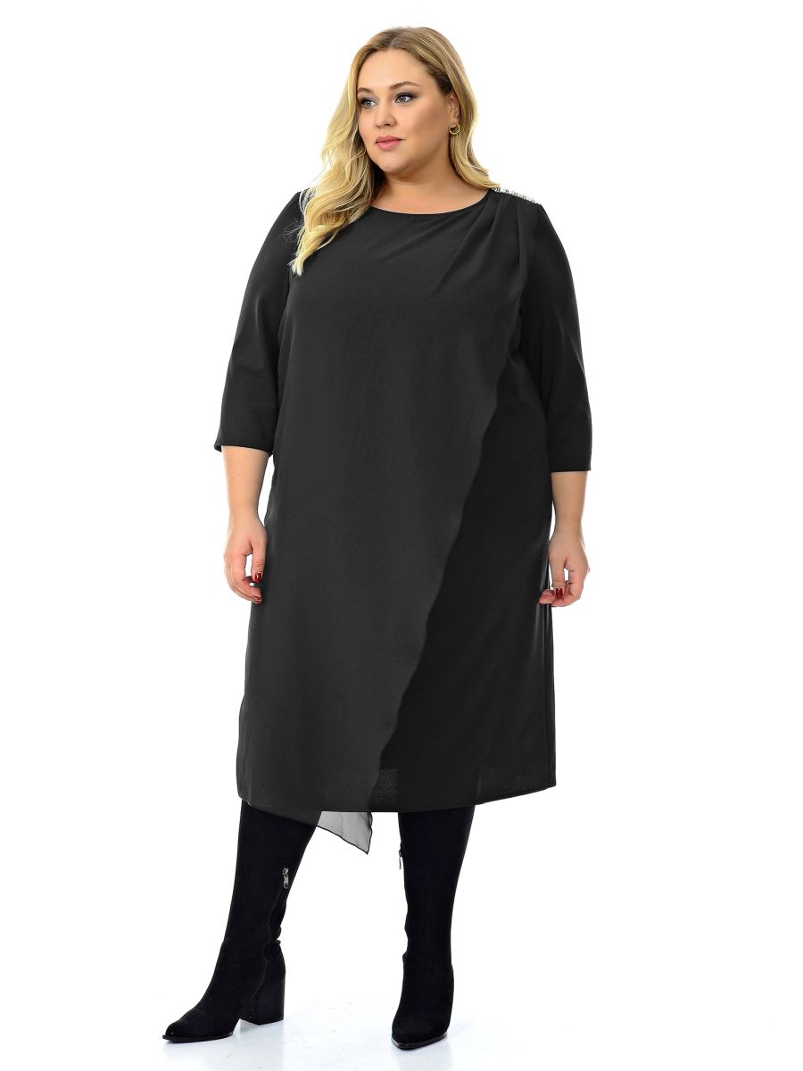 Платье прямого силуэта из крепа с эластаном. Спокойное, элегантное с изящной отлетной деталью из шифона по переду. На левом плече деталь переходит в мягкие складочки.