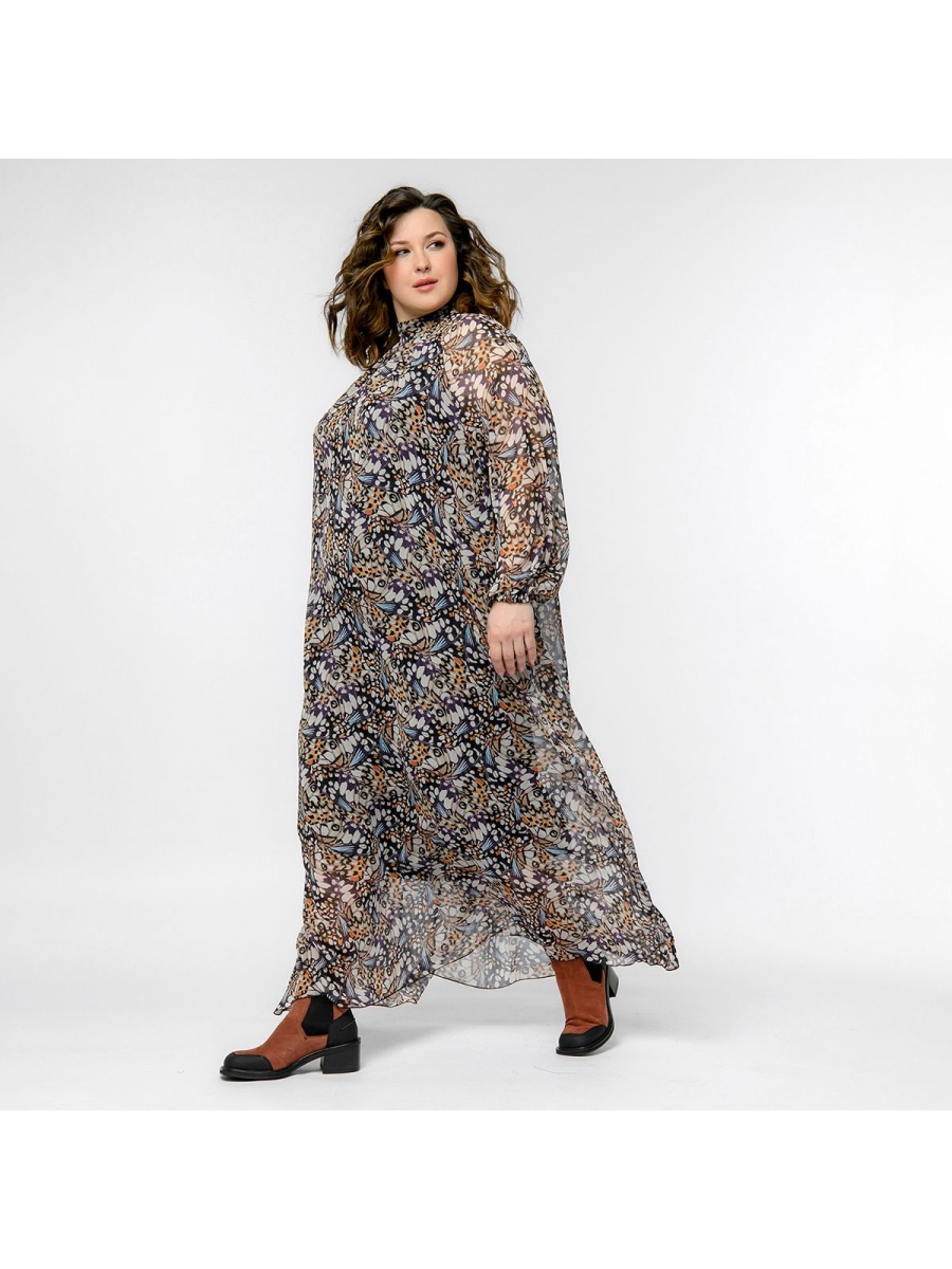 Воздушное, женственное платье из шифона с рукавом реглан. Модель выполнена на подкладе из эластичного трикотажа. Воротник-стойка дополнен вырезом "капля" на спинке и двумя пуговками.