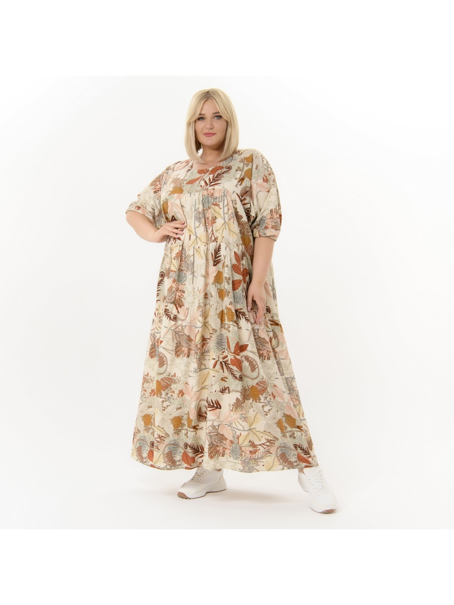 Платье длинное из штапеля свободного силуэта. Отрезное по линии груди, нижняя часть платья присборена. Рукав закрывает локоть, низ рукава на резинке. Вырез горловины округлый.