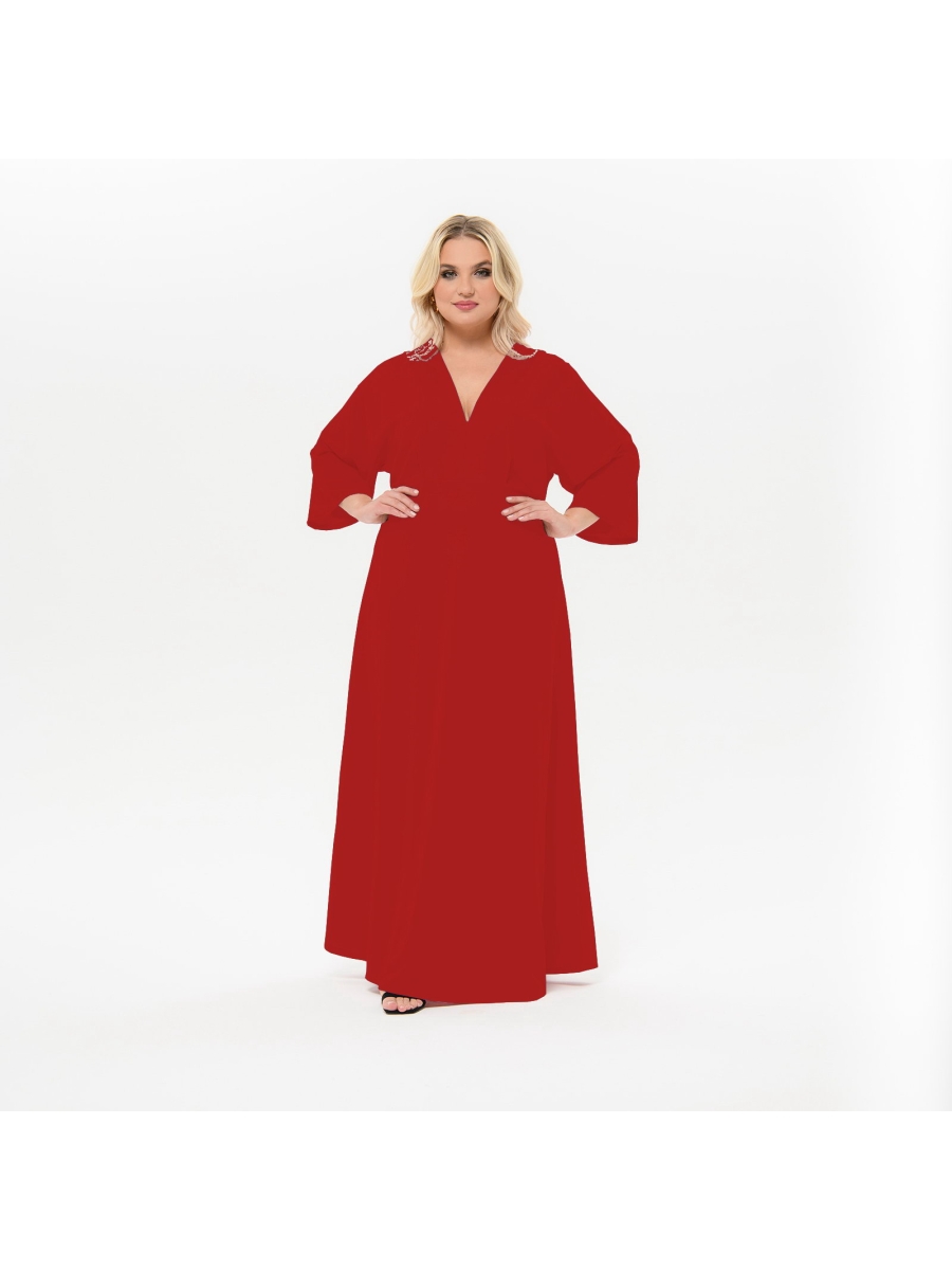 Платье длинное, романтичное, с глубоким V - вырезом, из эластичного плательного крепа, полуприлегающего силуэта. Под линией груди подрез.