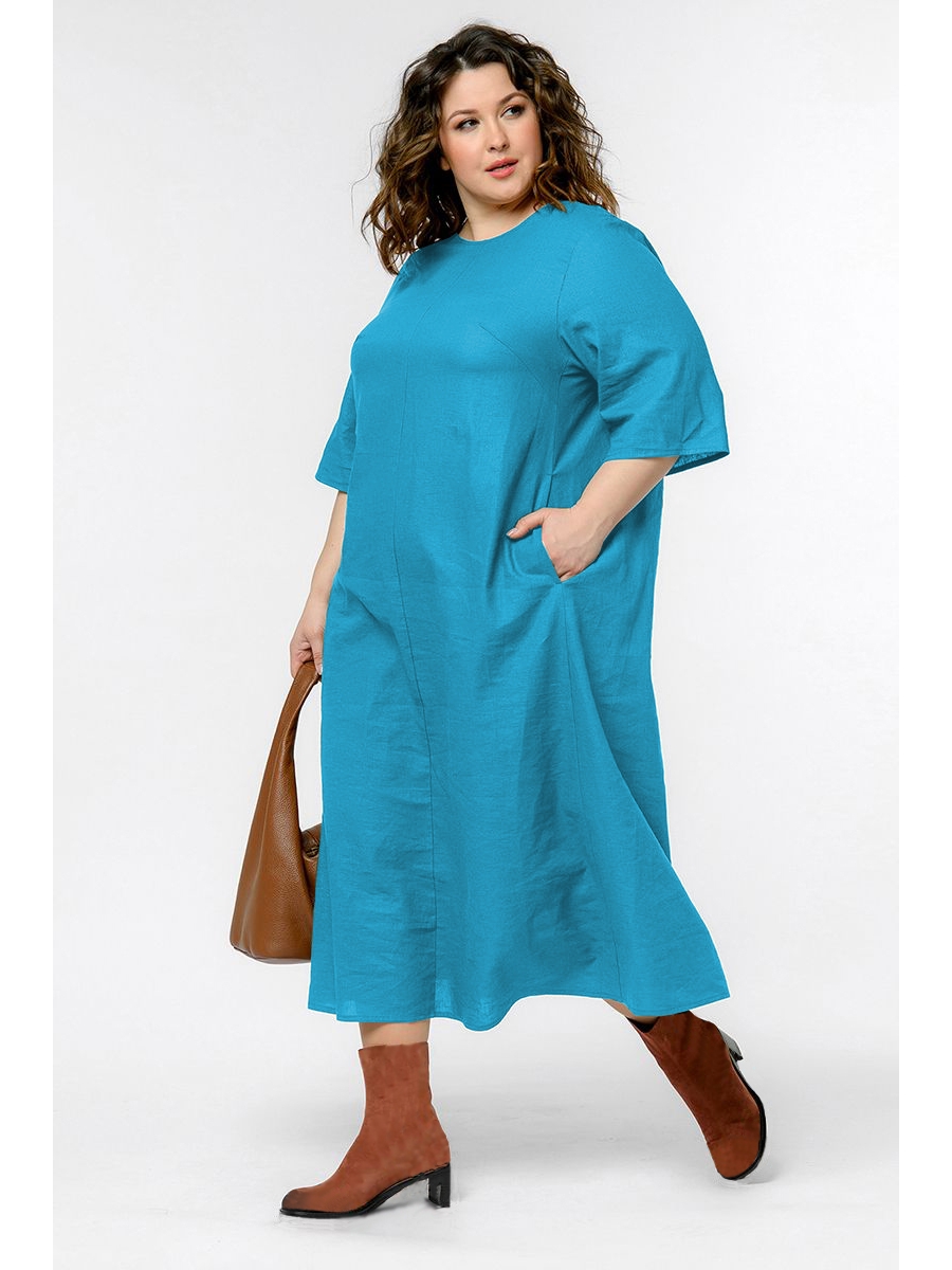 Платье свободного силуэта, из смесовой ткани, содержащей в составе лен и вискозу. Боковые швы смещены на переднюю половинку платья, в них обработаны карманы. Рукав втачной, свободный. Основным декоративным элементом является вырез горловины на спинке,в который вставлена резинка, образующая сборочку.