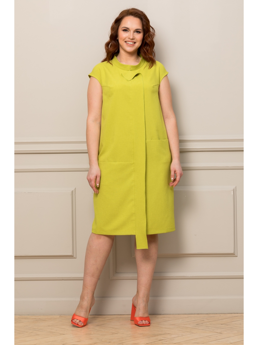 Платье прямого силуэта, со спущенным плечом. Перед со средним швом, с поперечными рельефными швами, с карманами. По среднему шву переда настрочен волан. Воротник - стойка