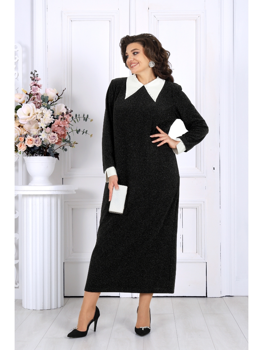 Платье женское полуприлегающего силуэта, выполнено из трикотажного полотна с фактурной лицевой стороной «люрекс». Модель с карманами в боковых швах, на трикотажной подкладке, с плечевыми накладками. Перед с нагрудными вытачками, направленными от пройм. В верхней части среднего шва спинки расположена застежка на тесьму-«молнию» (50 см), в нижней - разрез. Круглая горловина оформлена съемным воротником, декорированным спереди пришивными камнями. Рукав длинный, втачной, низ оформлен съемной манжетой с разрезом. Воротник и манжеты выполнены из сатина и пристегиваются к изделию при помощи прорезных петель и пуговиц.