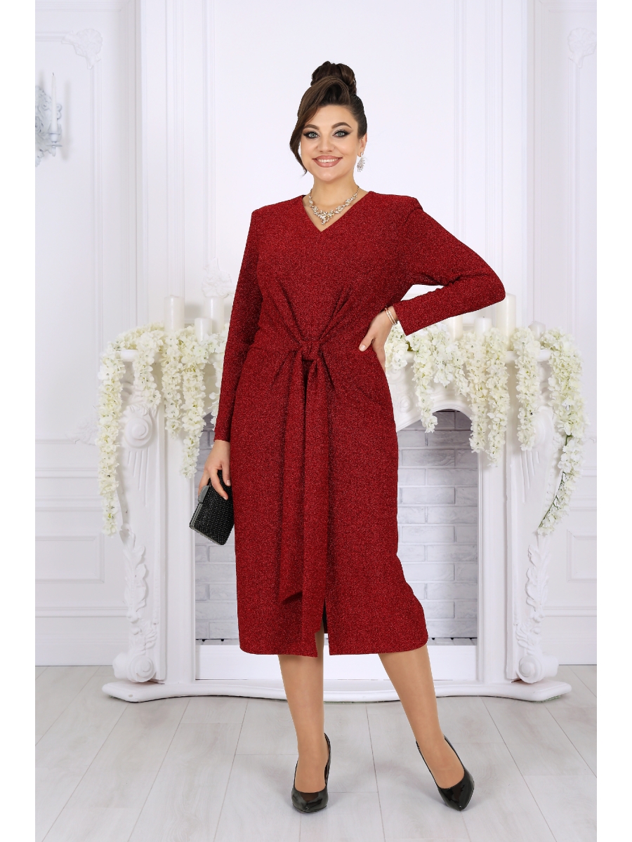 Платье женское, приталенного силуэта, выполнено из трикотажного полотна с фактурной лицевой стороной «люрекс». Модель без застежки, на трикотажной подкладке, с плечевыми накладками. Перед платья с разрезом в среднем шве и горизонтальным подрезом по линии талии; лиф цельнокроеный с поясами, завязывая которые разными способами, можно изменять внешний вид модели. На спинке обработаны талиевые вытачки. Горловина V-образной формы спереди и округлой по спинке. Рукав втачной, длинный. Длина платья – 113 см; длина рукава – 57 см.