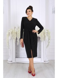 Платье женское, приталенного силуэта, выполнено из трикотажного полотна с фактурной лицевой стороной «люрекс». Модель без застежки, на трикотажной подкладке, с плечевыми накладками. Перед платья с разрезом в среднем шве и горизонтальным подрезом по линии талии; лиф цельнокроеный с поясами, завязывая которые разными способами, можно изменять внешний вид модели. На спинке обработаны талиевые вытачки. Горловина V-образной формы спереди и округлой по спинке. Рукав втачной, длинный. Длина платья – 113 см; длина рукава – 57 см.