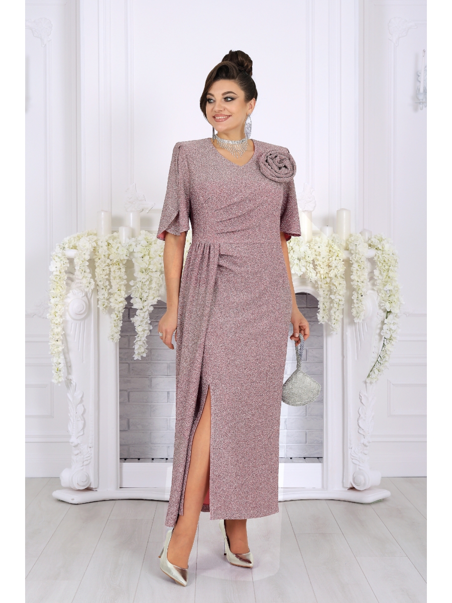 Платье женское полуприлегающего силуэта, выполнено из трикотажного полотна с фактурной лицевой стороной «люрекс». Модель на трикотажной подкладке, с плечевыми накладками. В левом боковом шве обработана застежка на потайную тесьму-«молнию» (35 см). Перед платья с горизонтальным подрезом по линии талии и отлетной деталью в шве подреза. В правой части переда обработан рельеф с разрезом в нижней части. Вдоль рельефного шва заложены односторонние складки, направленные к центру переда. Спинка с талиевыми вытачками. Горловина спинки округлая, по переду V-образная, углубленная. Рукав короткий, втачной, формы «крылышко на запах», со скругленными краями. Платье дополнено съемным «цветком» из основного полотна. Длина платья - 136 см; длина рукава - 31 см.