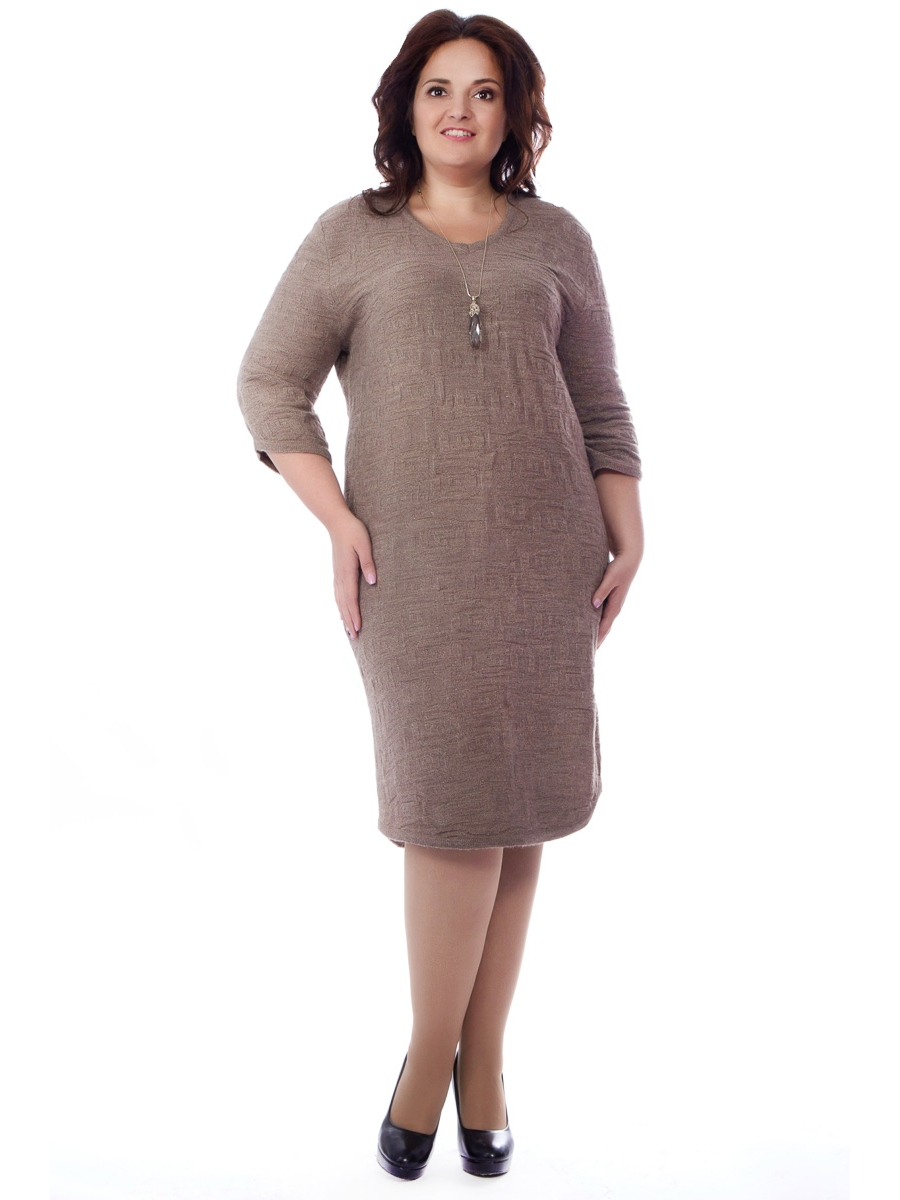 Привлекательное платье полуприлегающего силуэта бежевого цвета. Платье выполнено в технике «ручного вязания» с содержанием шерсти. V-образный вырез, низ втачных рукавов и низ изделия обработаны двусторонней лицевой бейкой. По изделию вывязан рисунок — розы.