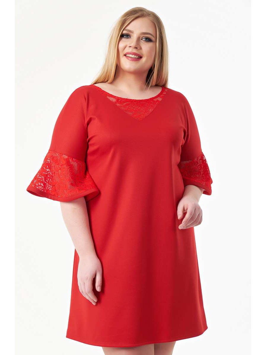 Очаровательное платье А-силуэта из трикотажного полотна красного цвета. Круглый вырез изделия эффектно подчеркнут кружевом и обработан атласной бейкой. Цельнокроенные рукава дополнены воланами из кружева и обработаны окантовкой. Аксессуары в комплект не входят.