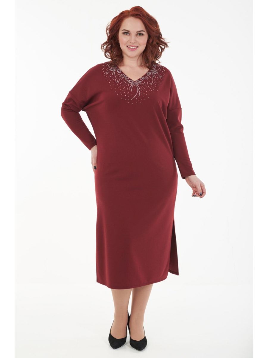 Женственное платье полуприлегающего силуэта из трикотажного полотна бордового цвета. Фигурный вырез изделия обработан внутренней обтачкой и украшен декоративным рисунком из страз. Платье со спущенной проймой и втачными рукавами. По бокам изделия-разрезы. Длина изделия по спинке от плечевого шва до низа изделия - 120 см. Рост фотомодели — 170 см.