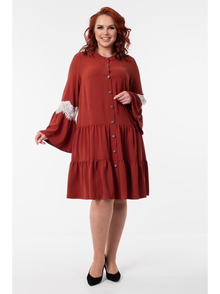 Стильное платье свободного силуэта из текстильного полотна цвета терракот. Круглый вырез изделия обработан воротником-стойкой. По переду изделия выполнена планка с застежкой на пуговицы. Юбка дополнена широкими оборками. Втачные рукава дополнены вставками из кружева. Длина изделия по спинке от плечевого шва до низа изделия — см. Рост фотомодели — 170 см.