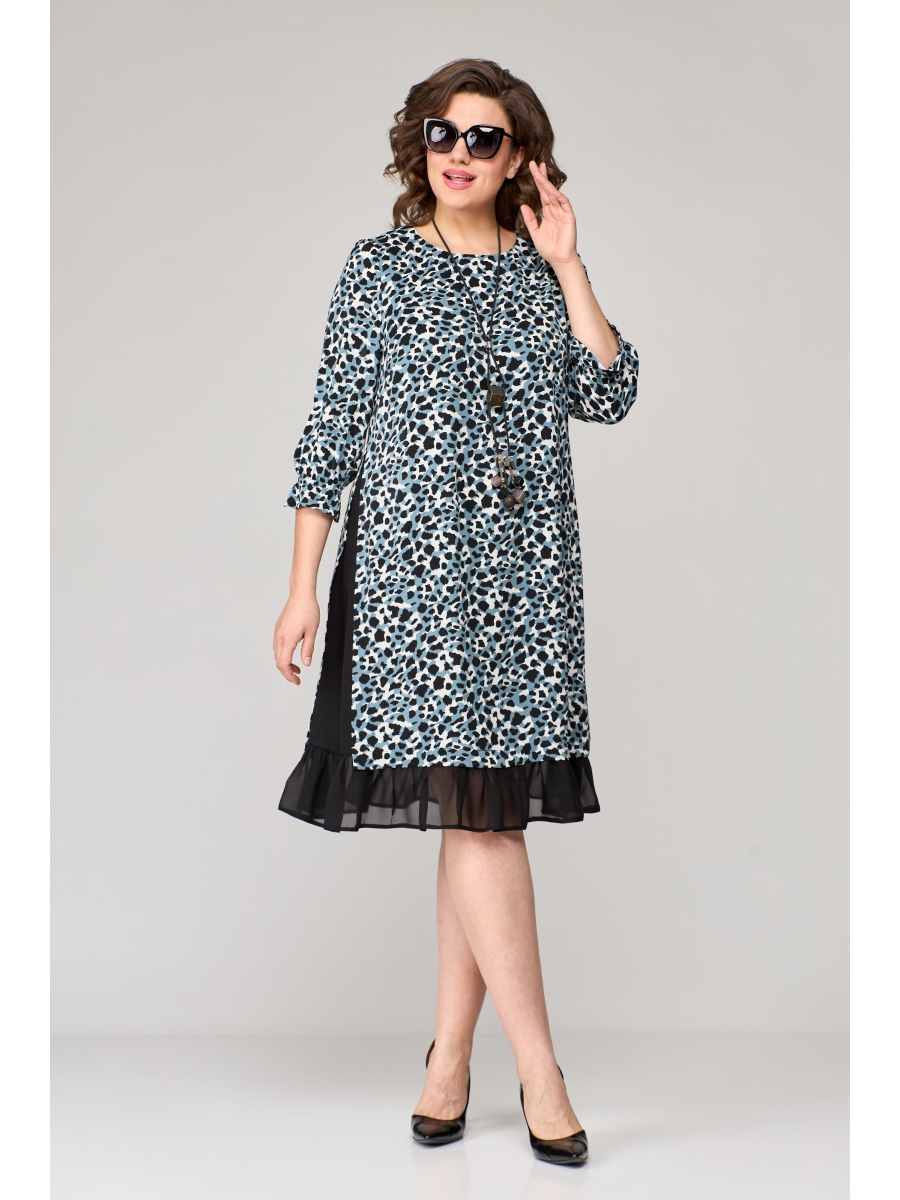 Платье женское нарядно-повседневное полуприлегающего силуэта слегка расширенное к низу, выполнено из текстильного полотна в сочетании с шифоном. Вырез горловины "лодочкой" обработан обтачкой, рукав втачной 3/4. По низу платья волан из шифона, по спинке потайная молния. Декором служит вставки из шифона по боковым швам платья.
