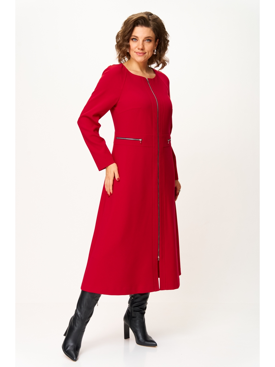 Платье с центральной застежкой на тесьму молния, отрезное по линии талии с широким втачным поясом на поясе обработаны декоративные молнии. Горловина круглая. Рукава реглан с плечевой вытачкой.