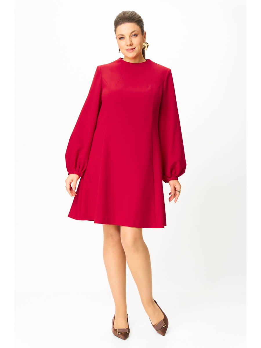 Стильное женское платье из плательной ткани с содержанием вискозы. Платье «А» образного силуэта с рельефными швами по переду и спинке. Горловина круглая с цельновыкроенной стойкой. Застежка на тесьму молния в центральном шве спинки. Рукава втачные, со сборкой по низу, на узком манжете с застежкой на петлю и пуговицу. Платье без подкладки.