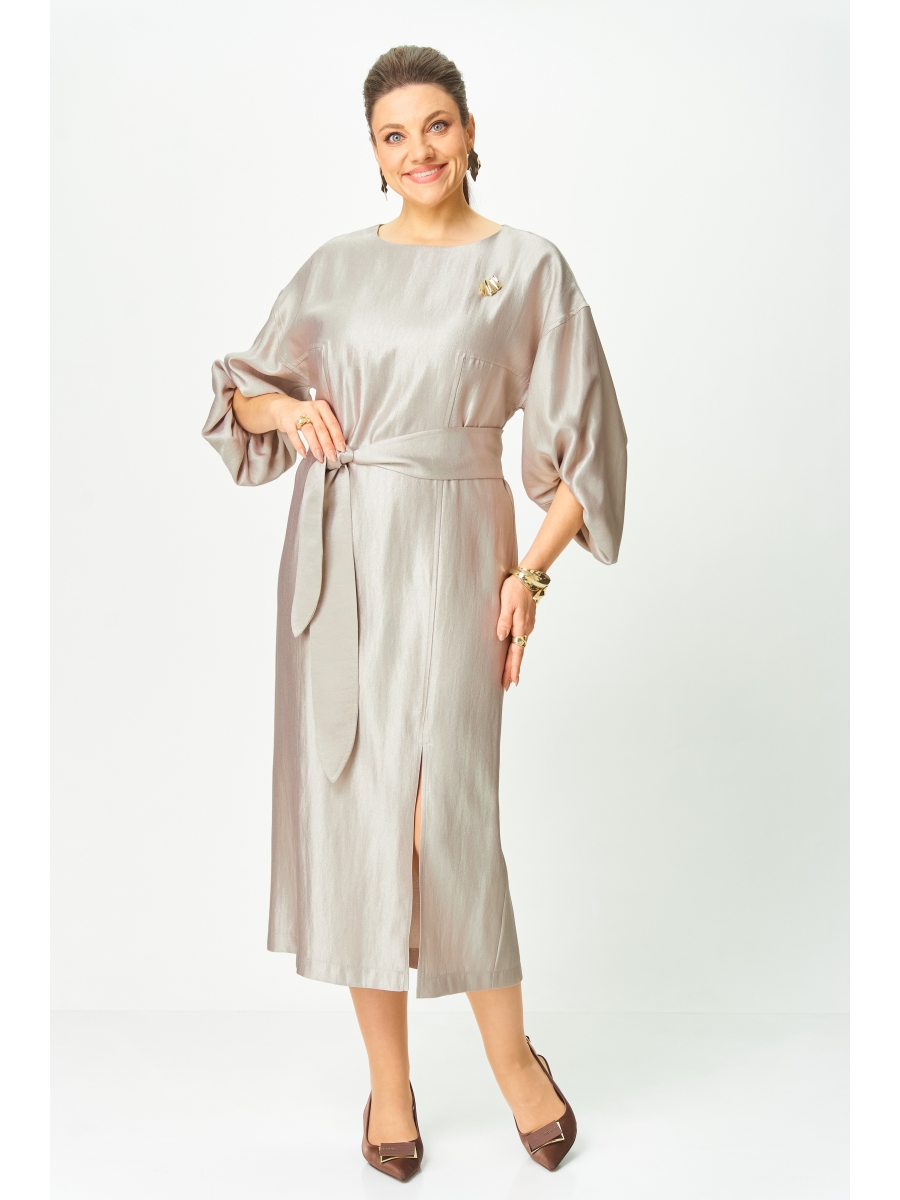 Платье прямого силуэта, с отрезными бочками и разрезом по низу платья. Застежка на декоративную молнию в центральном шве спинки. Горловина круглая. Рукава со спущенной проймой. Рукав широкий, с асимметричным низом, собранным на резинку.