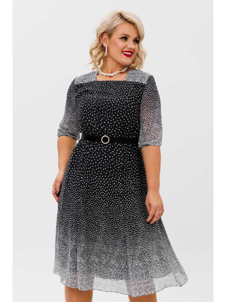 Элегантное женское платье из шифоновой купонной ткани прилегающего силуэта на подкладке. Отлично подойдет как для повседневной носки, так и на любое торжесвенное мероприятие. От линии бедер платье расширяется к низу. Горловина П-образной формы, по верхней части - кокетки. По полочке прилегание создается за счет рельефов, выходящих из подреза, по спинке - за счет среднего шва с молнией и рельефами. Рукав 3/4 длины, по низу резинка.