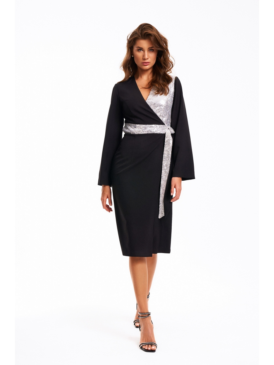 V-образный вырез горловины. Перед с фигурными рельефами, выходящими из проймы. Правая часть переда с отрезным фигурным поясом, выполненным из отделочного материала «пайетки». Левая часть переда полностью выполнена из отделочного материала «Пайетка». Спинка платья с двумя талиевыми вытачками. Юбка переда и спинки с талиевыми вытачками. Рукав втачной длинный, расклешенный к низу. Платье длиной ниже линии колена с притачным поясом (одна сторона выполнена из «пайетки»), который можно завязать на бант.