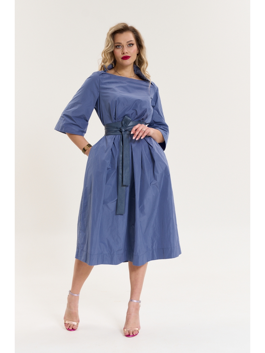Элегантное женское платье из текстильной ткани. Отрезное по линии талии. По полочке объем груди создается за счет направленных складок из подреза. Объем юбки создается за счет центральной встречной и 2-х односторонних складок. По бокам в юбке-карманы. Рукав втачной, 3/4 длинны с отворотом. Вырез горловины лодочка с отложным воротником. Пояс из эко-кожи.