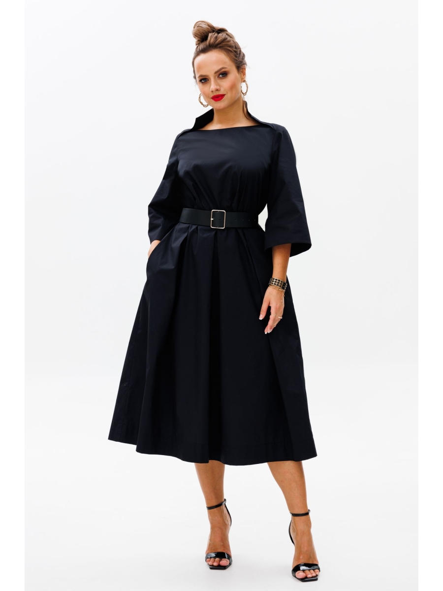 Шикарное черное платье с поясом ремнем. Идеально на любую погоду: под босоножки либо под сапоги и пальто. Отличный вариант универсального изделия: подойдет как для повседневного и офисного гардероба, так и для праздничного выхода. Отрезное по линии талии. По полочке объем груди создается за счет направленных складок из подреза. Объем юбки создается за счет центральной встречной и 2-х односторонних складок. По бокам в юбке-карманы. Рукав втачной, 3/4 длинны с отворотом. Вырез горловины лодочка с отложным воротником.