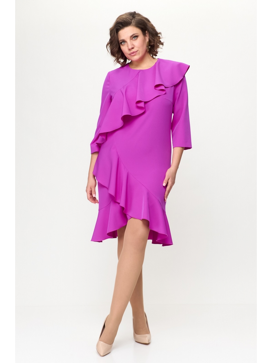 Оформить заказ →Нарядное женское платье из стрейчевой ткани с добавлением вискозы. Силуэт полуприлегающий. Вырез горловины круглый с застежкой на потайную молнию по спинке. Рукав ¾. Нарядность платью придают широкие ассиметричные воланы по переду платья и фигурный низ.