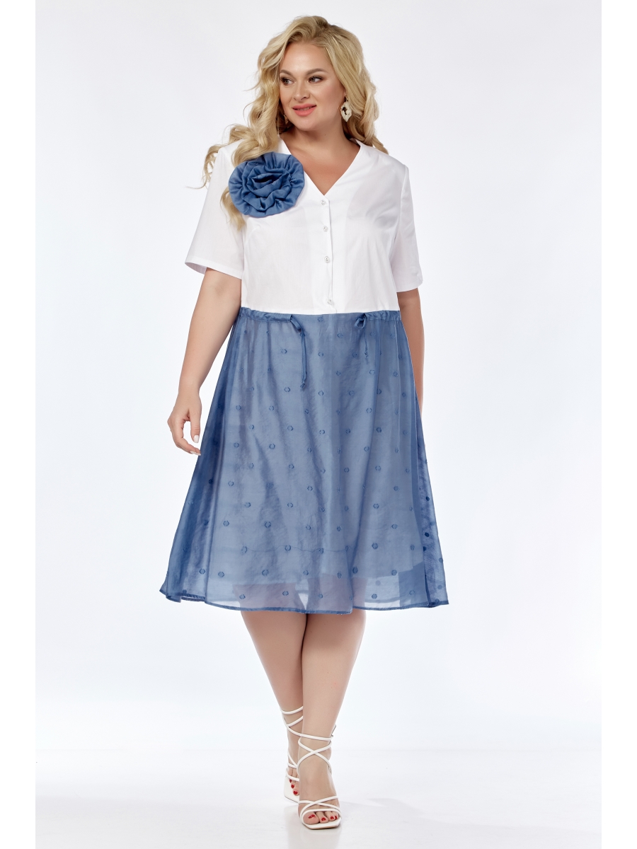 Платье женское полуприлегающего силуэта, двухцветное. Застежка центрально-бортовая на петли и пуговицы, на талии кулиска. Нижняя часть платья на подкладке, перед полочки украшен декоративной розой.