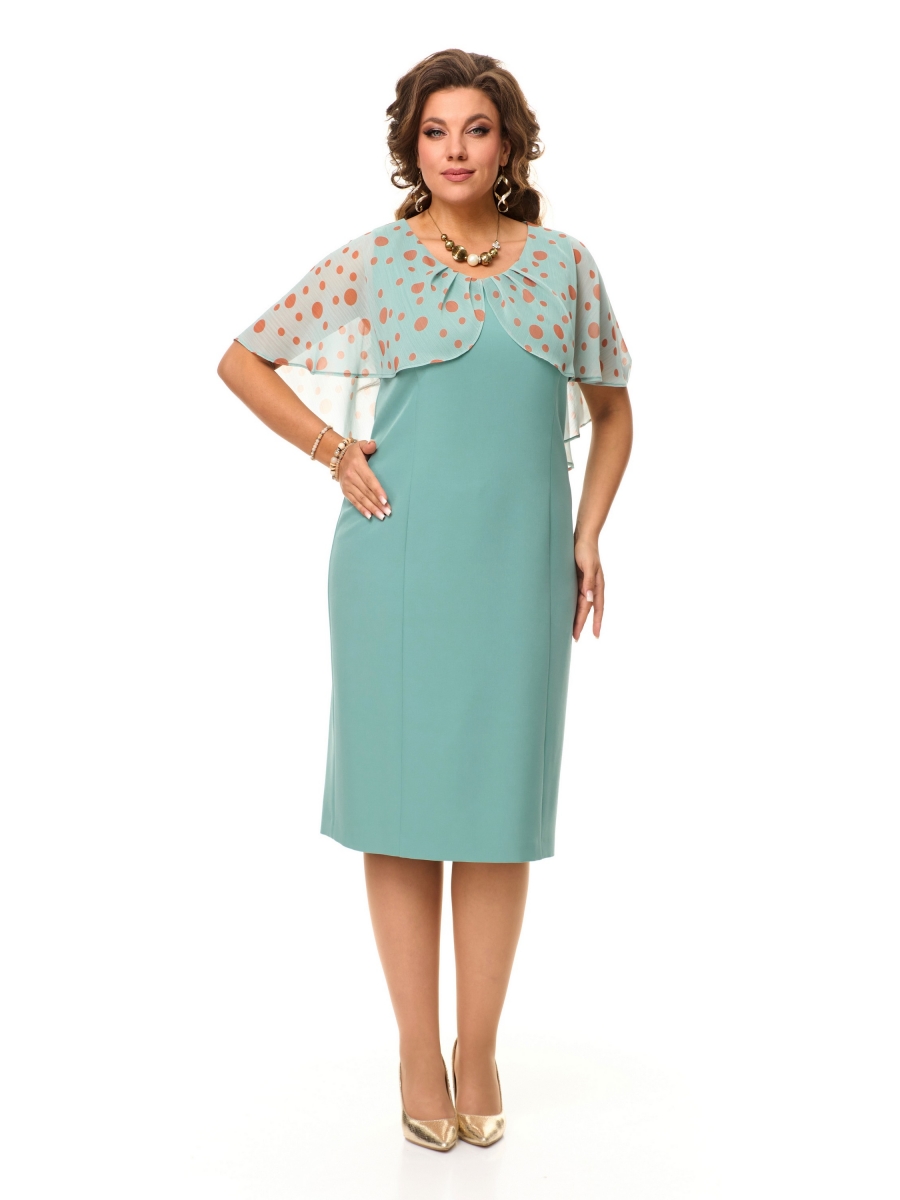 Платье женское нарядное прилегающего силуэта с рельефами по спинке и полочке, изготовлено из костюмно-плательной ткани. Вырез горловины u-образный, обработан обтачкой. Верх платья украшен перелинкой из шифона, у горловины складки, низ обработан швом в подгибку или улиткой. Пройма обработана обтачкой. По спинке потайная молния и шлица. Украшение в комплект не входит.