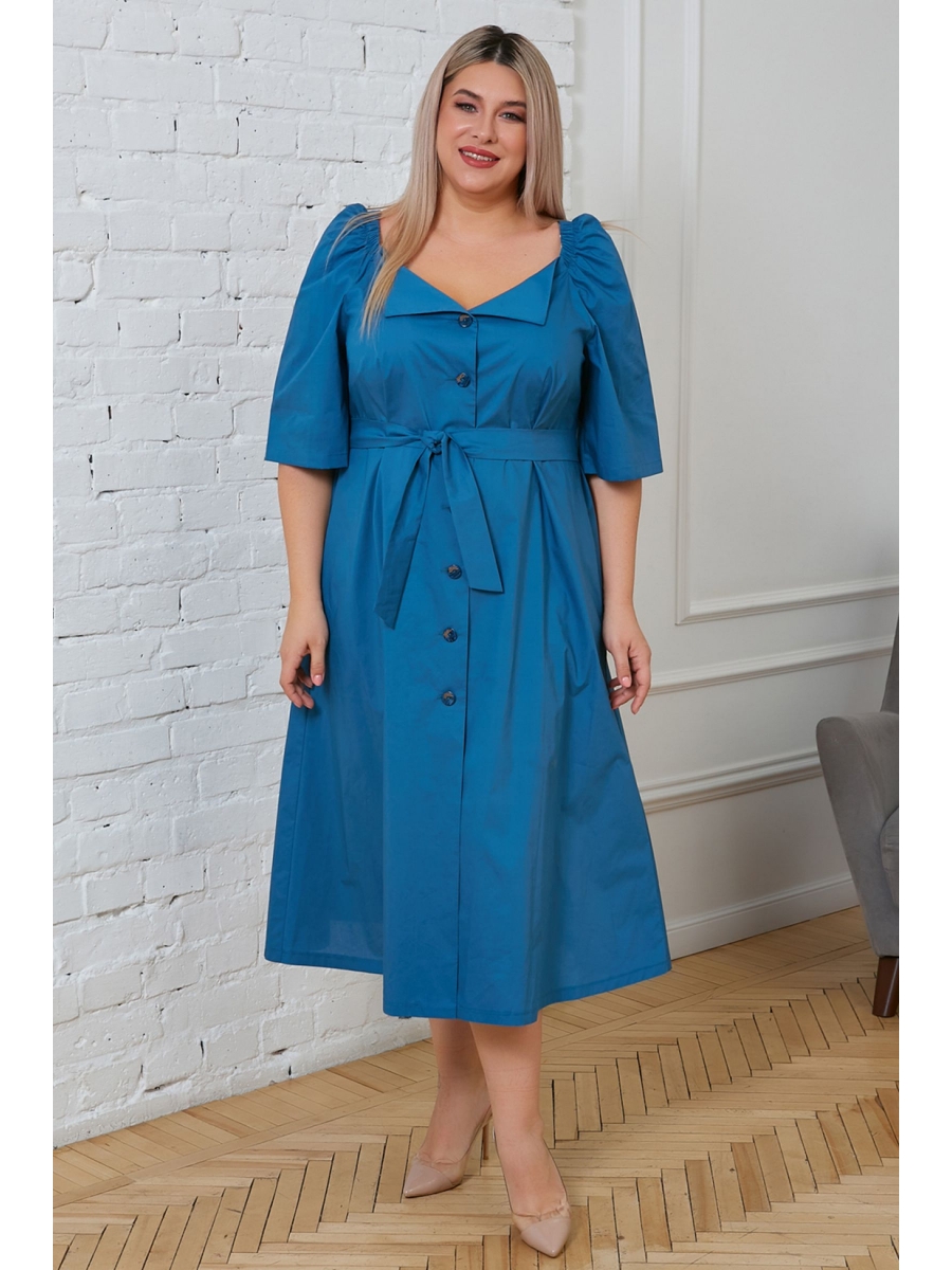 Изящное платье прилегающего силуэта из хлопковой ткани, длиной за линию колен. Комфортное прилегание по фигуре - за счет вытачек переда и спинки. Линия талии отрезная. По переду центральная застежка на петли и пуговицы на всю длину изделия. Вырез горловины фигурный, дополнен отложными уголками. В боковых швах удобные карманы. Рукава полуреглан длиной до линии локтя, по окату оригинально присобраны на резину. Низ ровный. Модель дополнена поясом из основной ткани.