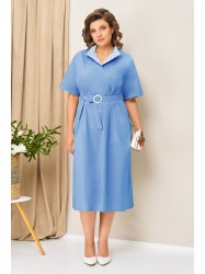 Нарядно-повседневное платье А-силуэта из хлопкового текстиля со спущенным коротким рукавом. Воротник платья-полустойка с отделкой из ткани с рисунком горох.