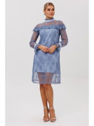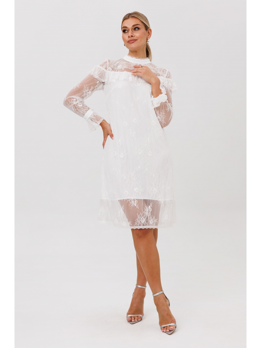 Это платье, сотканное из воздуха и тончайших нитей. Нежное кружевное полотно, подобно легкой дымке, обволакивает силуэт, заключая его в элегантные и строгие линии прямого кроя. Изысканность кроется в деталях: кокетки, украшающие лиф спереди и сзади, мягко ниспадают изящными волнами, подчеркивая линию плеч и даря образу трогательную, почти что хрупкую грацию.
