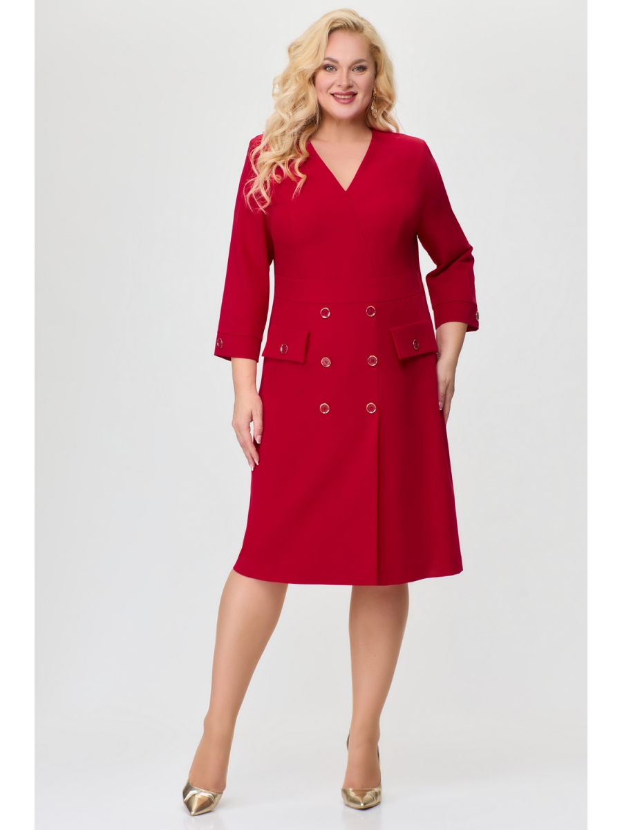 Платье женское полуприлегающего силуэта, рсширенное к низу, с втачным рукавом. Горловина v- образной формы, с имитацией запаха. Платье по переду отрезное по линии талии. Спинка со средним швом. В левом боковом шве обработана застежка на потайную тесьму – молнию. Передняя часть выполнена с имитацией застежки на пуговицы и декоративными клапанами. Рукав длиной ¾, с притачной манжетой.