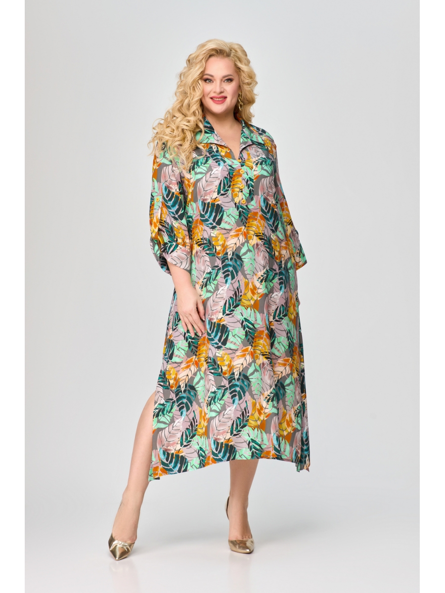Платье А-силуэта с втачным рукавом. По горловине отложной воротник и планка с декоративными пуговицами. Спинка со средним швом. Рукав с притачной манжетой, фиксируется патой. В боковых швах карманы. Низ платья фигурный, с разрезами.