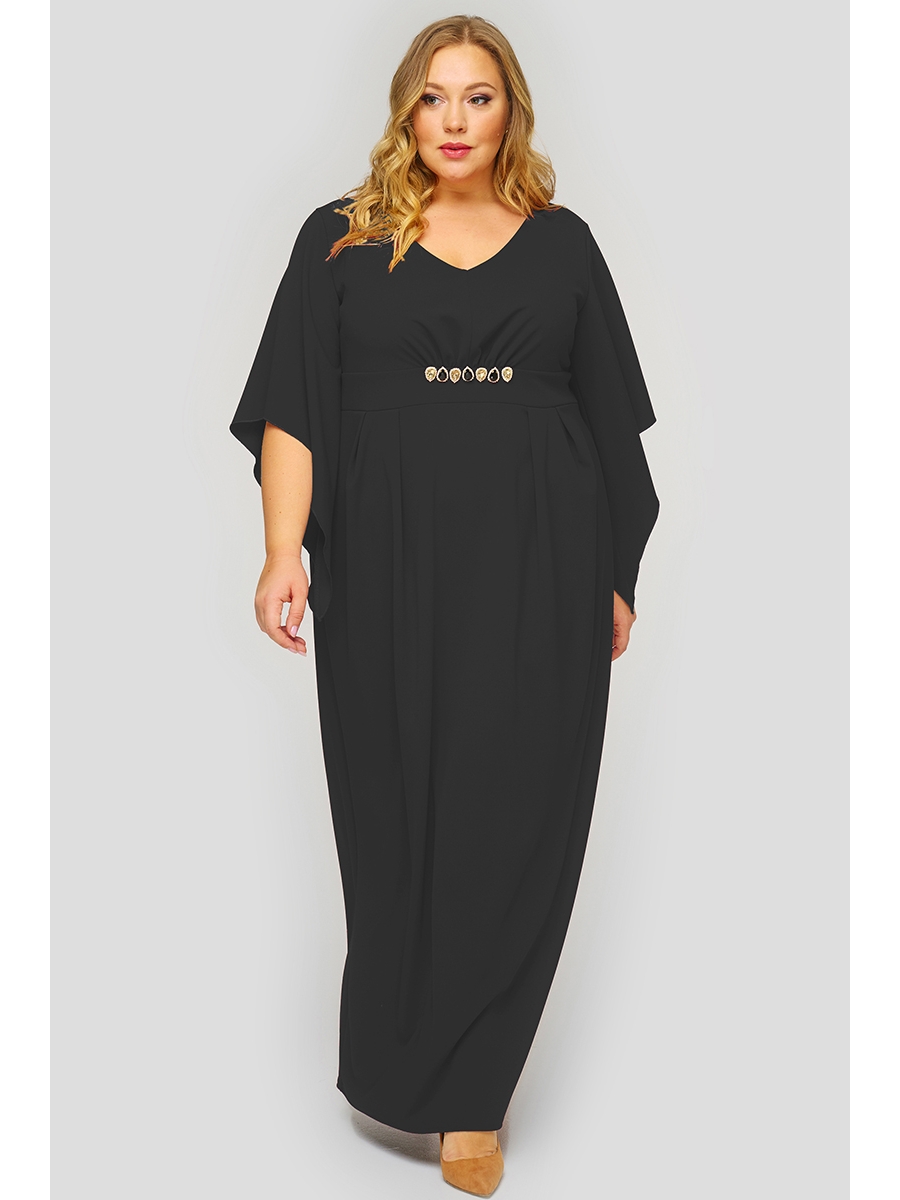 Вечернее платье полуприлегающего силуэта. V-вырез горловины по переду и по спинке. Рукав в виде "крыла" заканчивается углом по нижнему шву. Верхняя часть отрезная, на подкладке, со сборкой по центру переда под линией груди. Двойной втачной пояс. Юбка "тюльпан" с разрезом по центральному шву задней половинки.