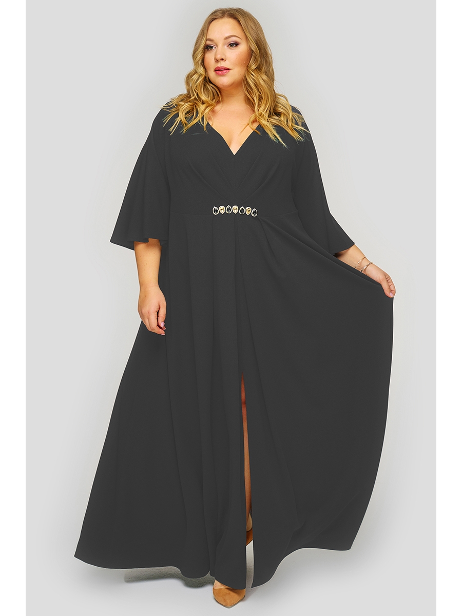 Длинное вечернее платье из эластичного крепа. V-образный вырез горловины. Рукав расклешенный, цельнокроенный. Юбка отрезная, с мягкими складками по талии и разрезом по центру передней половинки.