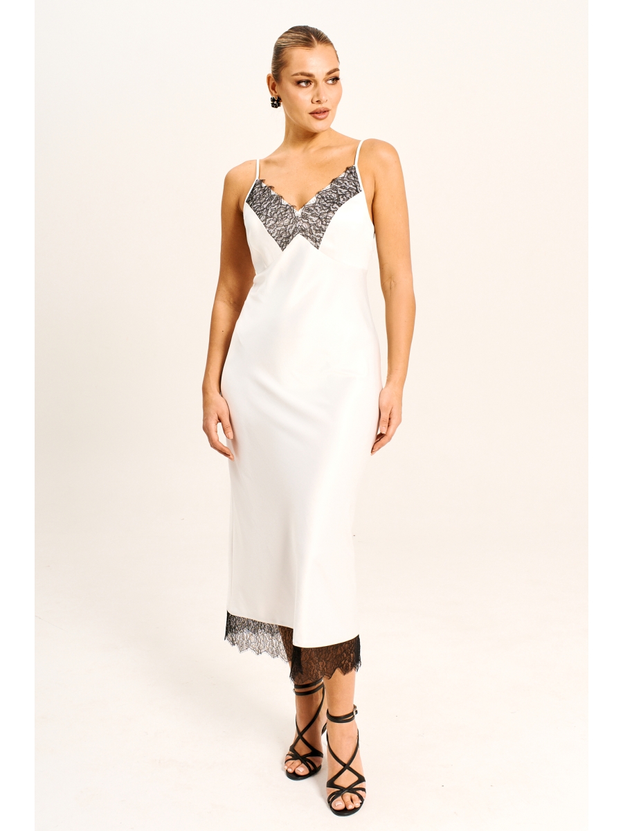 Платье - миди прилегающего силуэта выполнено из струящегося шелк - сатина на регулируемых бретелях и молнией в боковом шве. Подрезы по линии груди и низу платья дополнены мягким французским кружевом, которое держит форму. Платье полностью соответствует заявленному размеру.