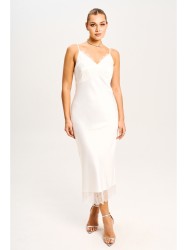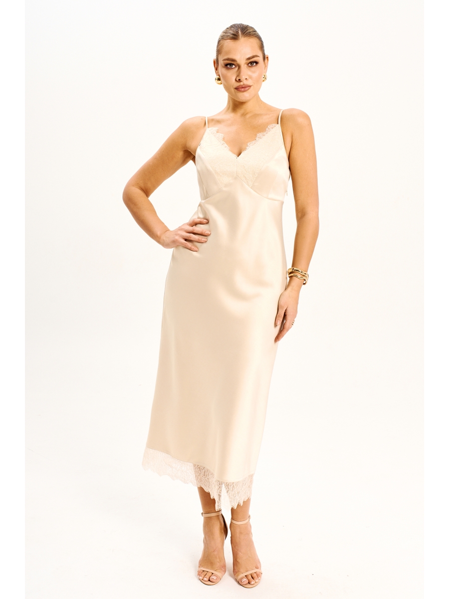 Платье - миди прилегающего силуэта выполнено из струящегося шелк - сатина на регулируемых бретелях и молнией в боковом шве. Подрезы по линии груди и низу платья дополнены мягким французским кружевом, которое держит форму. Платье полностью соответствует заявленному размеру.