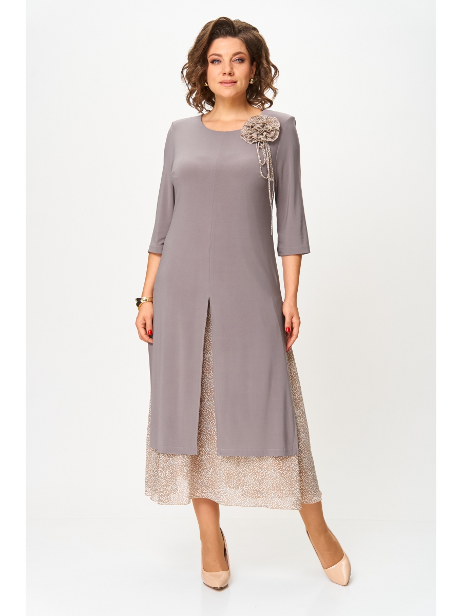 Платье женское полуприлегающего силуэта расширенное к низу, выполнено в комплектации из двух предметов. Верхнее платье – из мягкого эластичного материала, с высокими разрезами по переду, спинке и бокам, с втачным рукавом ¾. По линии груди вытачки. По левой части переда съемный цветок.
