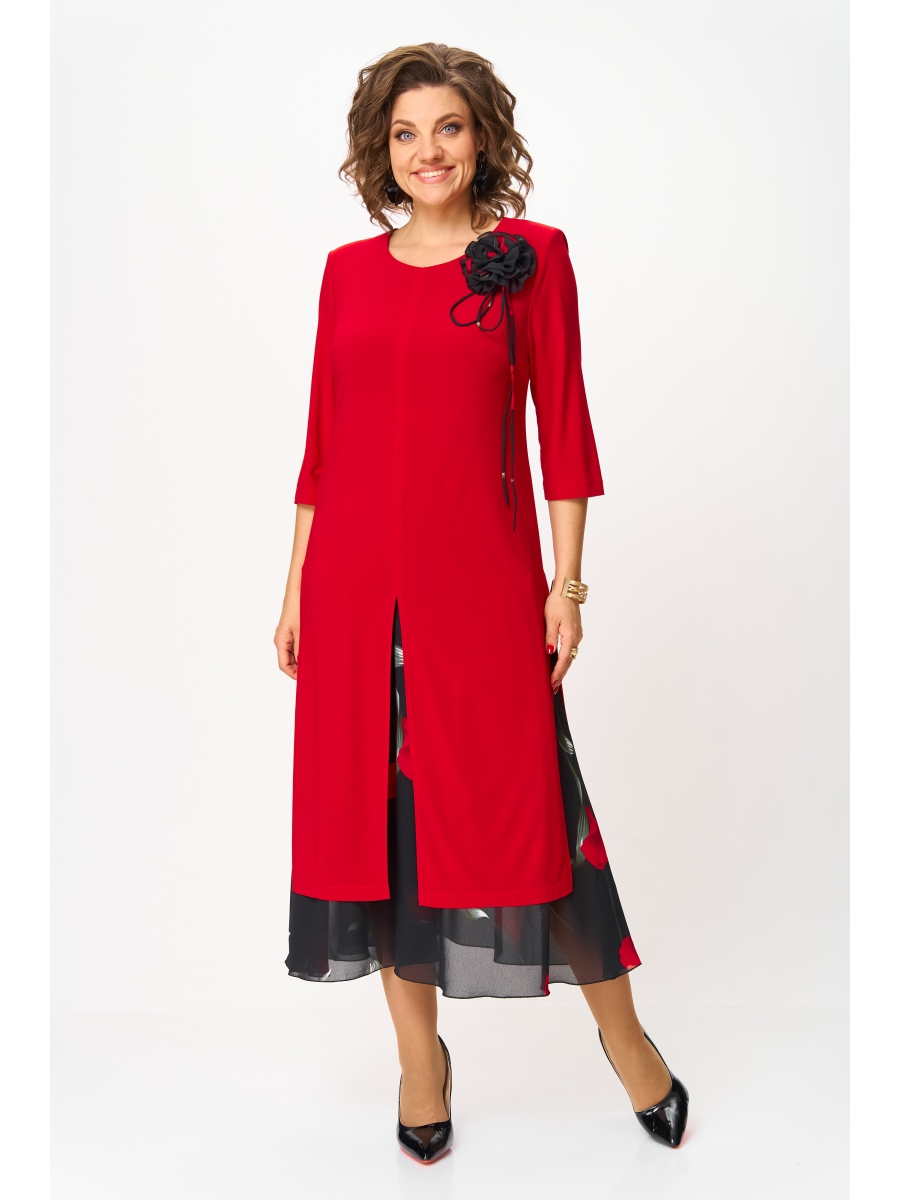 Платье женское полуприлегающего силуэта расширенное к низу, выполнено в комплектации из двух предметов. Верхнее платье – из мягкого эластичного материала, с высокими разрезами по переду, спинке и бокам, с втачным рукавом ¾. По линии груди вытачки. По левой части переда съемный цветок.