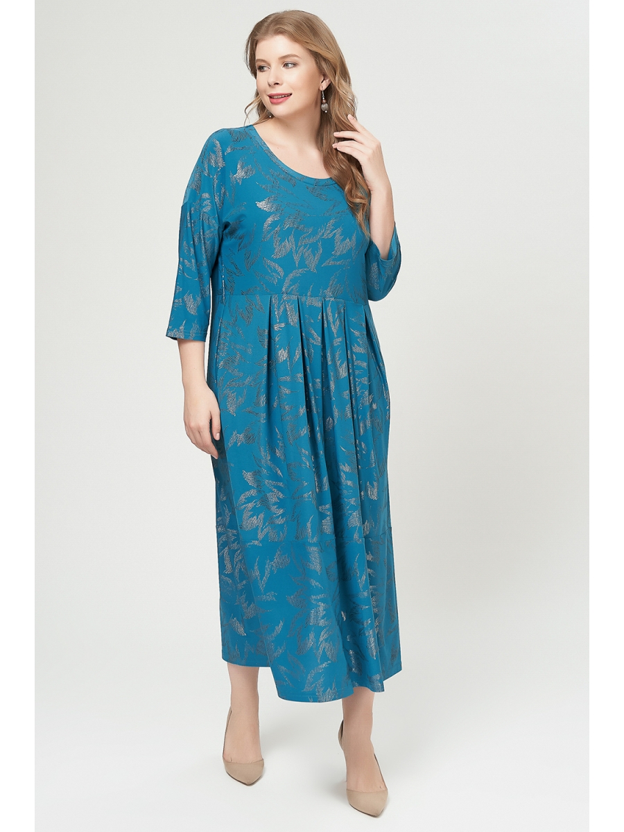 Нарядное платье из струящегося трикотажа - масло с блестящим принтом. Модель миди-длины, с округлым глубоким вырезом, втачными рукавами 3/4 со спущенной проймой и мягкой линией плеча, врезными боковыми карманами. Отрезная, выше линии талии, юбка с защипами, создающими крупную складку спереди, и прямая сзади. Платье идеально для образа пейзанки, подходит нежным романтичным натурам.
