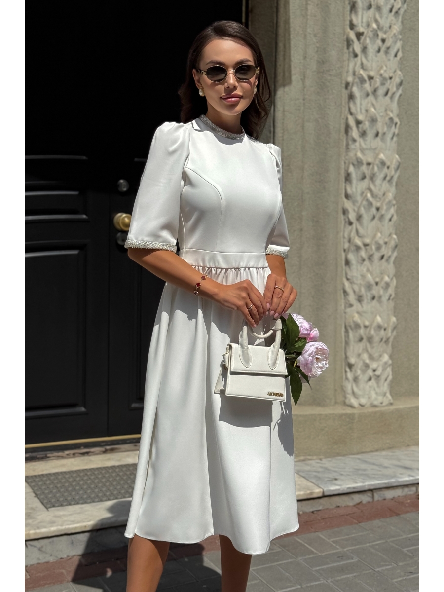 Белое элегантное платье — универсальная модель для повседневной элегантности и особых случаев. Полуприлегающий силуэт с отрезной талией подчёркивает фигуру, аккуратная сборка создаёт мягкое прилегание, а воротник-стойка и деликатная отделочная тесьма по горловине и рукавам добавляют нарядного блеска. Рельефные линии по переду и спинке визуально формируют «песочные часы», скрытая молния на спинке обеспечивает удобную посадку. Это идеальный выбор для любого праздничного мероприятия. Оно подчеркнет вашу элегантность и женственность. В этом платье вы будете звездой вечера!