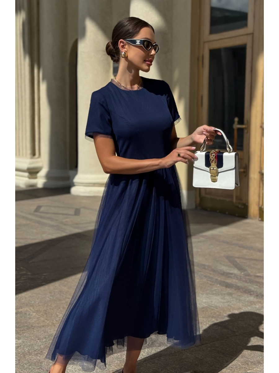 Верхняя часть переда и спинки (лиф) с рельефными швами, идущими из пройм вниз до шва талии. Верхняя часть спинки со средним швом от горловины до низа платья. От горловины вниз в среднем шве расположена застежка на потайную тесьму - ""молнию"". Верхняя часть переда и спинки на подкладке из плательной ткани. Нижняя часть переда и спинки (юбка) расклешенная к низу, двухслойная: нижний слой из плательной ткани, верхний слой из сетки, по срезу талии собранный на сборку. Горловина круглой формы обтачная. Рукава втачные, одношовные, двухслойные, короткие. Низа рукавов и горловина с притачной узкой деталью из сетки.