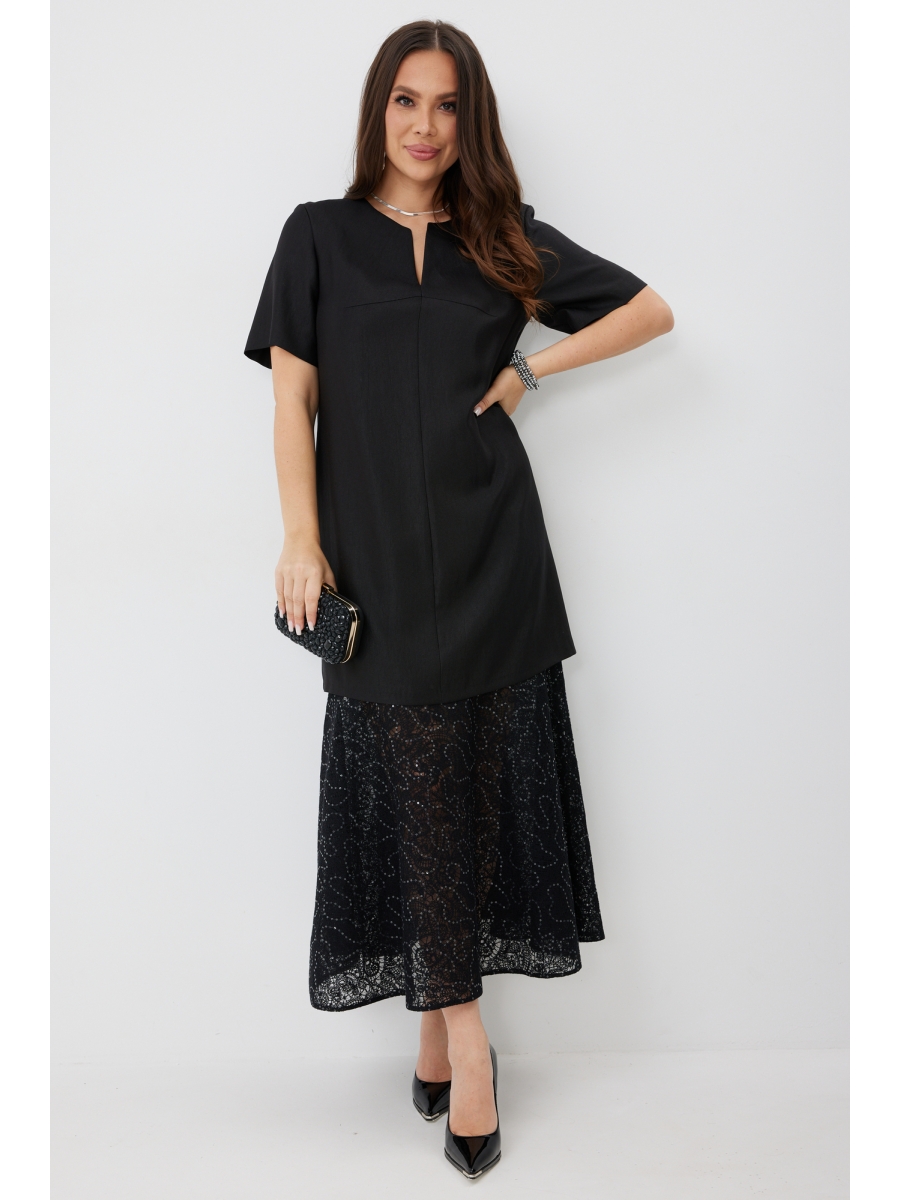 Оформить заказ →Элегантное платье свободного силуэта. Платье представлено, как нижнее платье из нежной подкладочной ткани, дополненной по низу притачным воланом из красивого кружева с пайетками, и верхнего короткого платья-туники из гладкой костюмной ткани. Застежка по спинке на потайную молнию.