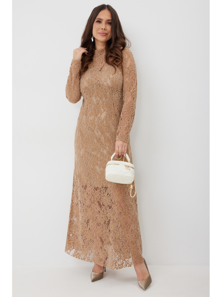 Элегантное и стильное платье макси из нежного бархатного кружева. Платье прилегающего силуэта с легким клешением книзу. Платье дополнено нижней комбинацией на тонких бретелях, выполненной из приятной к телу ткани в цвет кружева. Рукав втачной, дополнен притачным, слегка расклешенной кружевной манжетой с открытым срезом. Спереди плате с фигурным подрезом. Горловина обработана стойкой. Низ платья с открытым срезом.