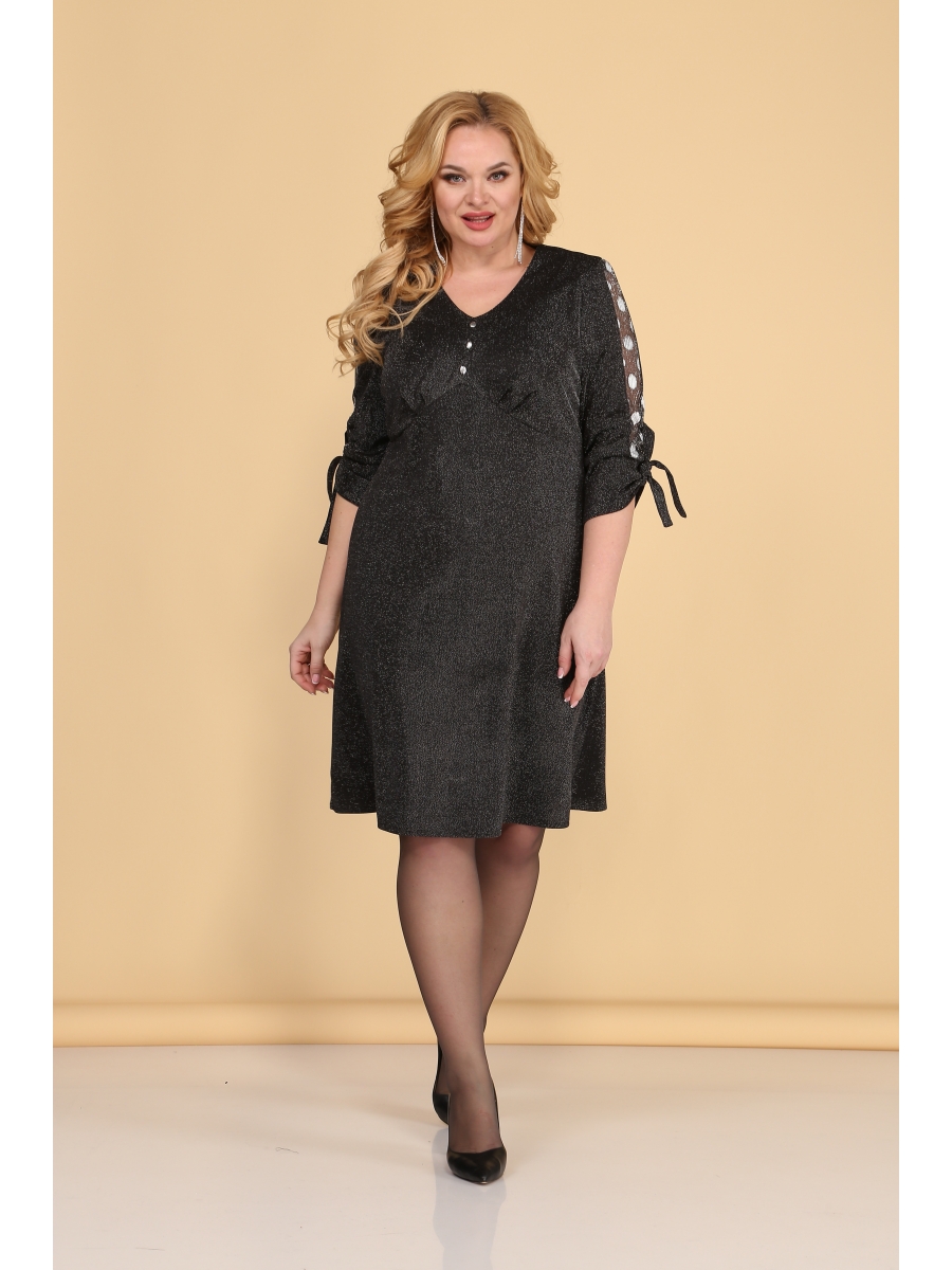 Нарядное платье А-силуэта на трикотажной подкладке. Выполнено из трикотажного полотна, имеющего матовый блеск и из гофрированной сетки, вставленной в рукава.