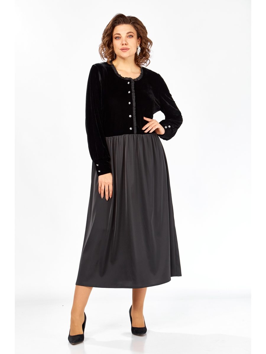 Платье женское нарядное А-силуэта, выполнено путем комбинирования тканей двух видов: бархата (верхняя часть) и атласа (нижняя часть). Платье отрезное по линии талии, нижняя часть по переду и спинке присобрана на сборку. Верхняя часть переда с центральной застежкой на петли и пуговицы. По горловине и краю борта обработана рюша. Рукава втачные на манжете.