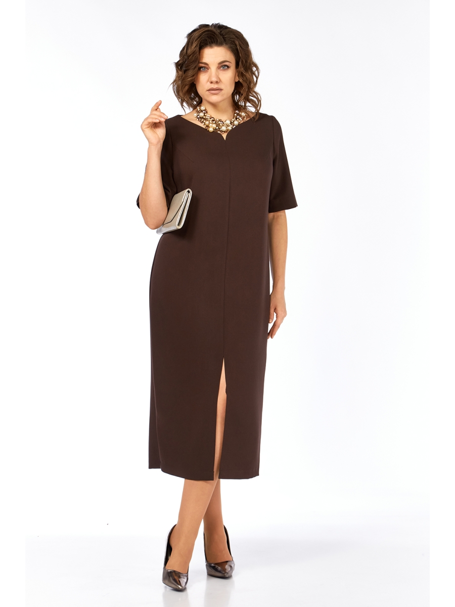 Платье женское, полуприлегающего силуэта, выполнено из плательно-костюмной ткани. Горловина фигурной формы. Перед с нагрудными вытачками и средним швом в котором обработан разрез. Спинка со средним швом. Рукава втачные, одношовные с небольшим разрезом по шву.